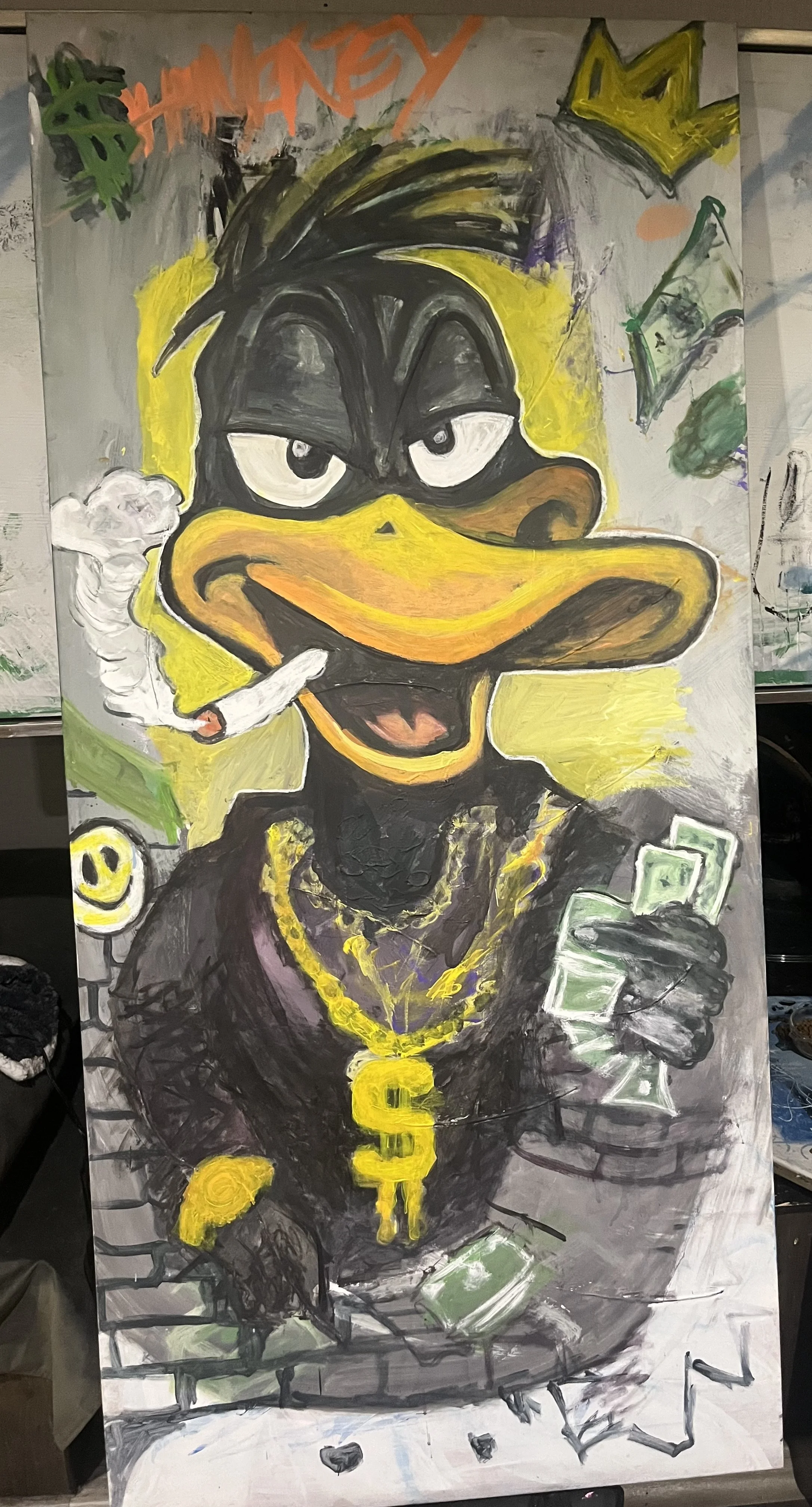 “Daffy the Dopeman Duck” Jan 14 Written By Founder In progress* 28x54 canvas hand painted. Once this piece is fully painted, I apply a protective acrylic sealant and then finish it off with a high-gloss epoxy resin pour. Founder
