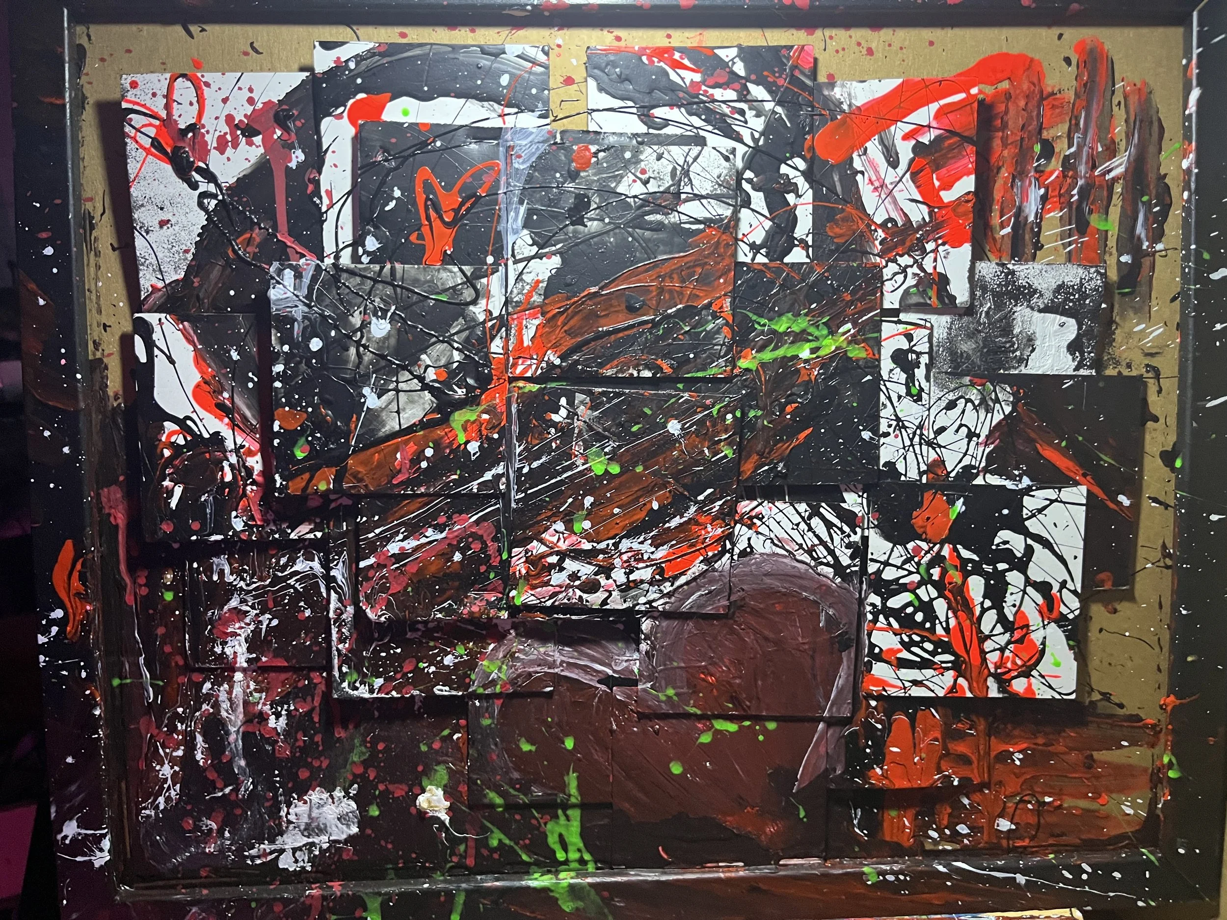 How I made this piece? I took a picture and the glass out of a frame and had an old piece of cardboard that I then cut up to smaller squares. I painted each piece one by one with random/yet intentionally felt brush strokes maybe some drizzle or splatter here and there.. then set the piece overlapping another. Nothing by accident. Even if it may have felt like it for a moment.